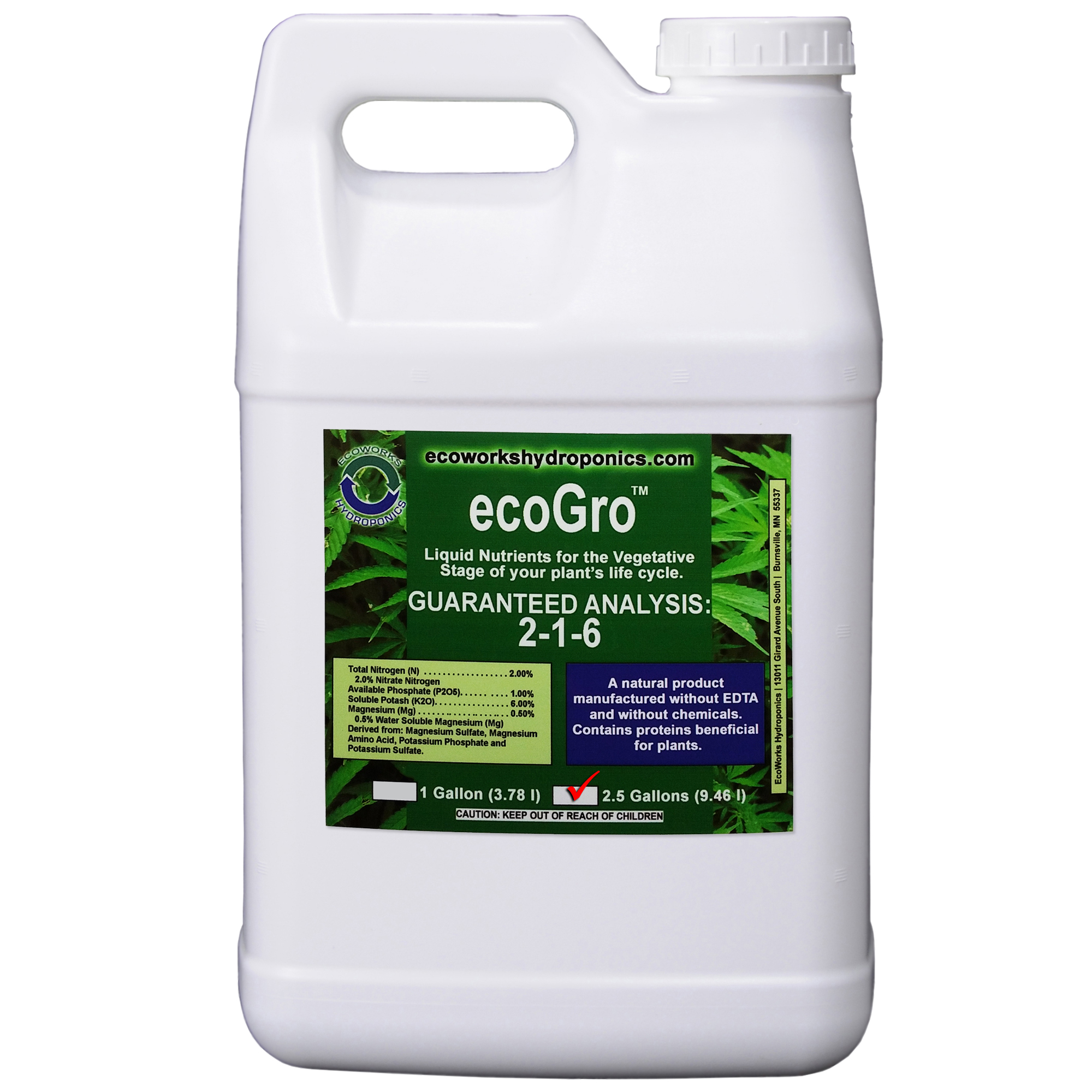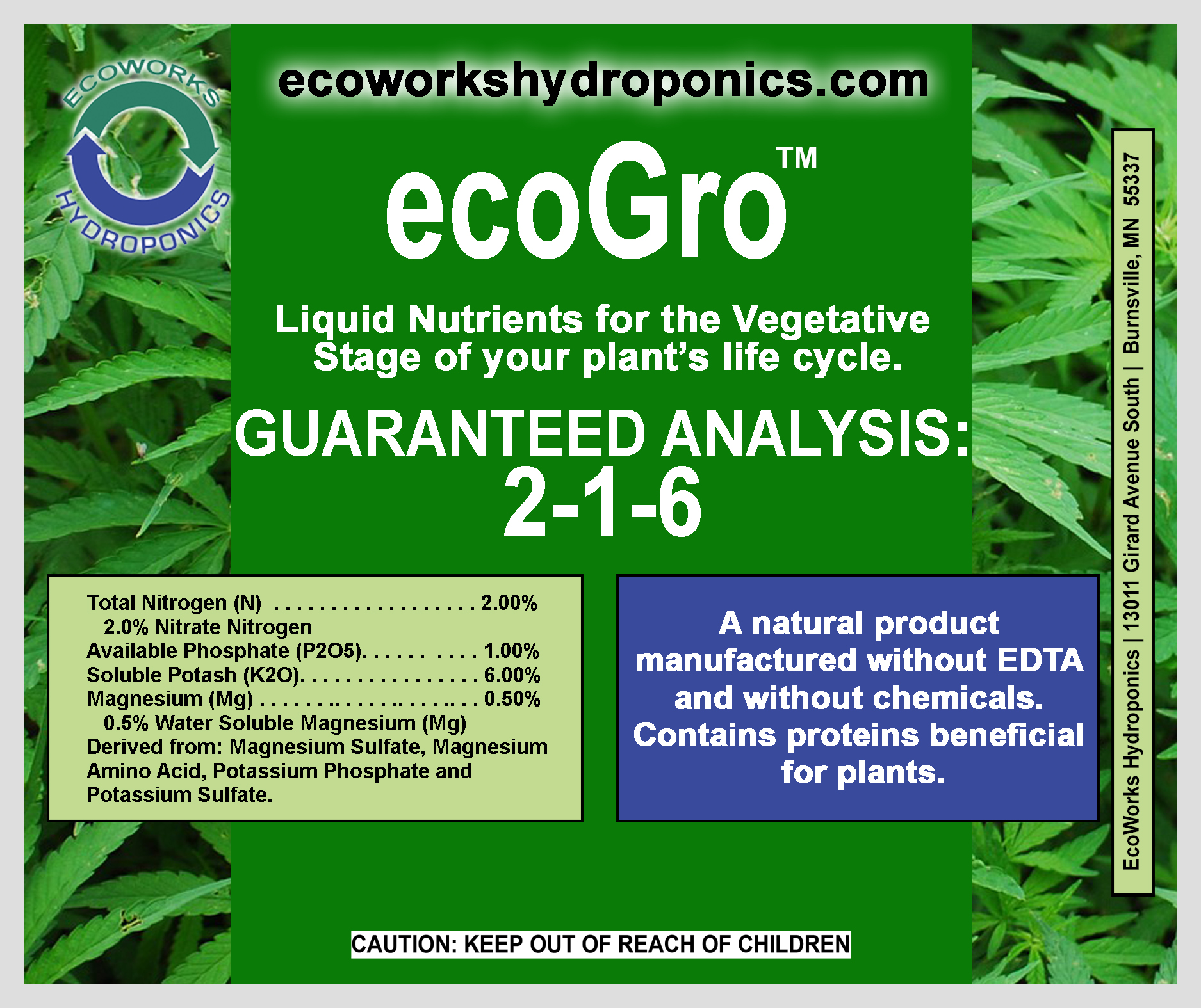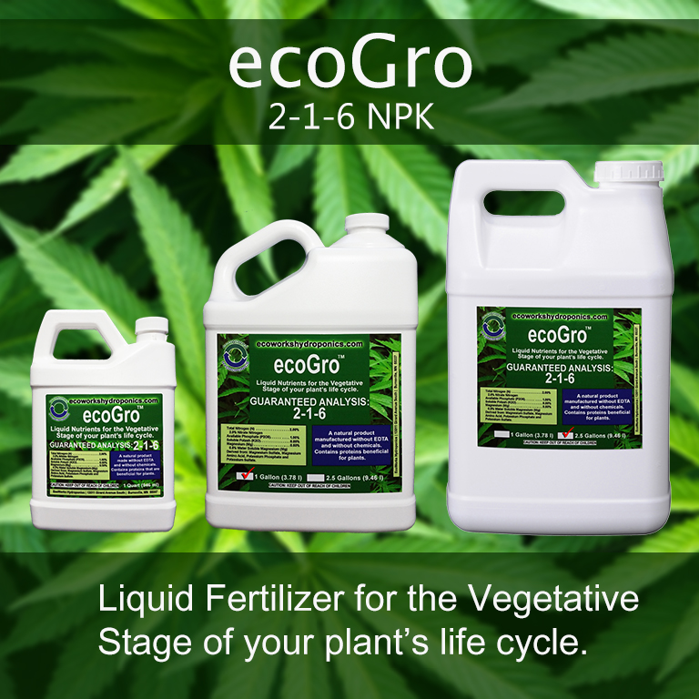 Eco Works Hydroponics has designed ecoGro to address the specific needs of the plant. The npk ratio of 2-1-6 supports vegetative growth and strong root development allowing for efficient carbon fixation and robust growth rates.